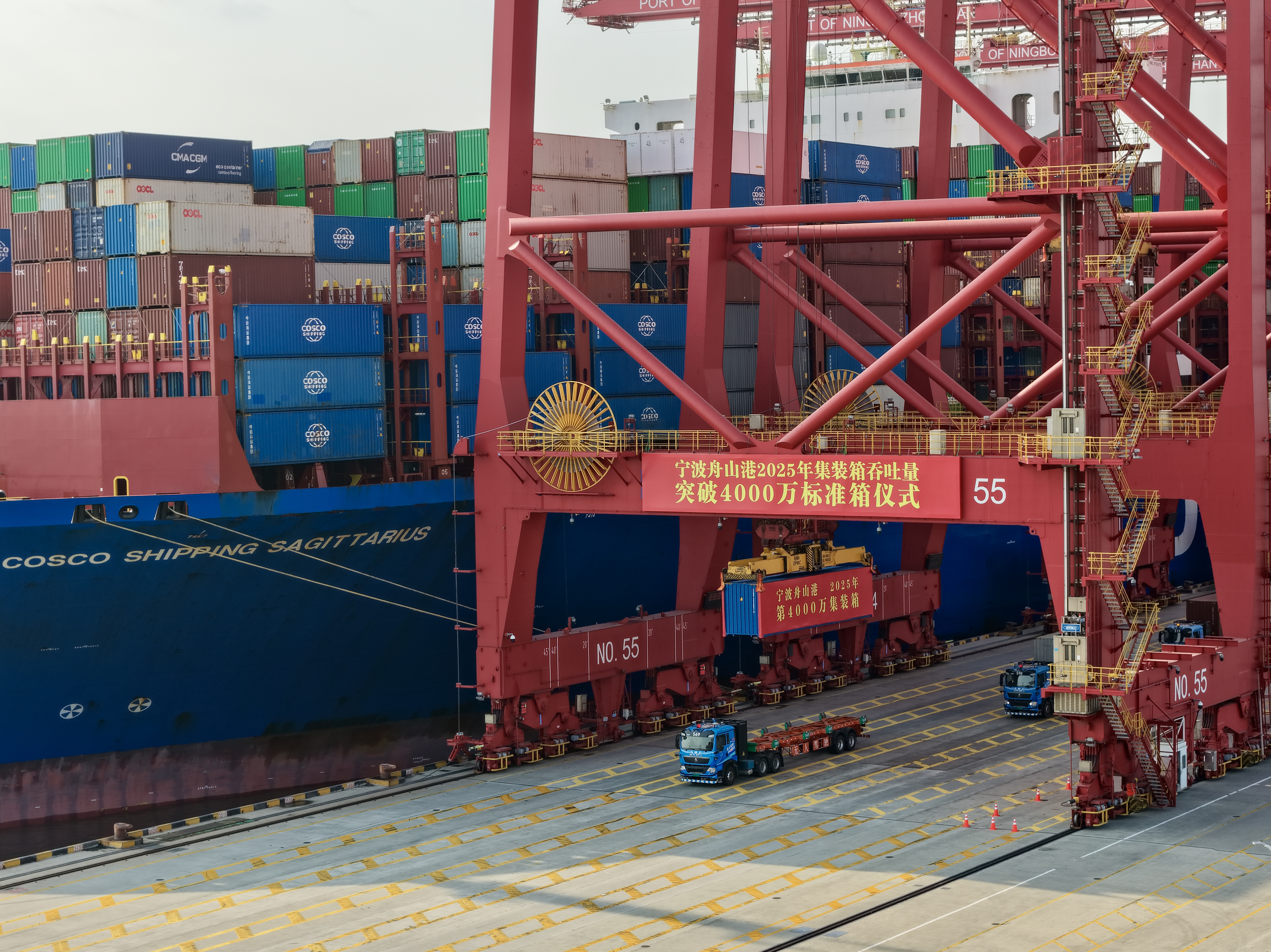 今天上午9时10分,宁波舟山港踏上历史性时刻——年集装箱吞吐量首次突破4000万标准箱,成功实现第四次“千万集装箱级”跃升,为中国海外制造再添硬核支撑。从量的积累到质的飞跃,宁波舟山港的增速书写了全球港口发展的“中国速度”:从1000万标箱到2000万标箱,用了7年;从1000万标箱到2000万标箱,用了7年;从2000万到3000万,用了6年;而从3000万到4000万,只用了4年时间。宁波舟山港也由此成为近十年来世界五大港口中发展最快、规模最大的港口。这一里程碑的背后,是浙江推进世界港口建设的坚定步伐,也是中国外贸平稳运行的鲜明体现。摄影:唐建凯