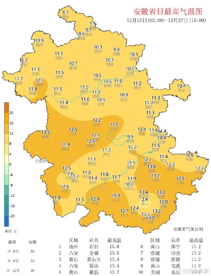 截至27日15:00,最高气温显示,长江中西部和长江以南地区在13℃左右,其他大部分地区在10℃左右。得益于阳光,2025年的最后一个周末充满了温暖。然而,新一波冷空气正在袭来。安徽大部分地区将经历“过年”雨雪天气。安徽省气象台预计,2026年31日至1月2日,我省将有一次降水过程,受冷风影响,部分地区有雨夹雪或小雪。全省平均气温将下降5至8摄氏度。同时,全省平均风力将增至3至4级,阵风7级。 28日(周日)全省具体预报:全省天气晴。 29日(周一):全省多云至晴。 30日(周二):淮河以北多云到多云,淮河以南多云f 淮河。 31日(周三)长江以北地区多云,傍晚有小雨。淮黑及北部地区有中雨,部分地区有雨夹雪;长江以南地区多云。 2026年1月1日(星期四):全省多云,有小雨,其中淮北及全省山区有雨夹雪或小雪。 1月2日(周五):淮河以北多云到多云;淮河以南多云,江南南部地区有小雨或雨夹雪。城市天气预报