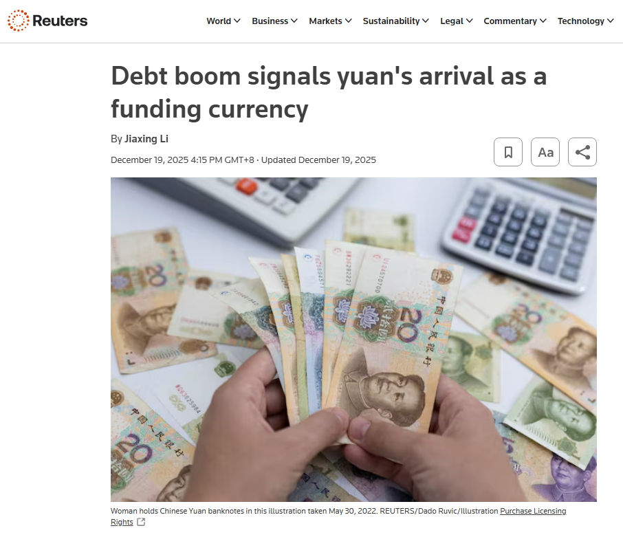如今,人民币已成为全球第四大支付货币和第三大贸易融资货币。近期,多家外媒注意到,国际投资者开始青睐人民币融资。分析其背后的原因,专业人士认为“主要是市场对人民币融资的基本需求拉动”。路透社近期报道称,投资者正在大规模购买人民币信贷资产,表明人民币正在成为全球融资货币。银行人士表示,人民币持有和消费需求的不断增长,标志着人民币国际化进程取得重大突破。路透社网站报道截图 路透社注意到,哈萨克斯坦开发银行今年9月提供了20亿元人民币的离岸人民币债券。这也是中亚第一家向公众发行人民币债券的金融机构。 10月,印尼政府也成功发行离岸RMB债券规模为60亿元人民币。这是东南亚主权机构首次发行以离岸人民币计价的长期公开“点心债”。报道援引德意志银行中国在岸债务资本市场主管塞缪尔·费舍尔的话说,“当前人民币融资的增长很大程度上是由市场对人民币融资的基本需求推动的。”他指出,“越来越多的国际投资者不仅将其视为套利,而且实际上将其纳入资产配置中,而且已经有一些来自中国以外的大额锚定订单。”路透社报道截图 路透社报道称,评级机构认为,相比波动较大的美元和欧元,人民币相对稳定,这进一步增强了人民币融资的吸引力。彭博社最近的一份报告也凸显了人民币债券的热潮。报告通过数据显示,截至目前,离岸人民币债券总量今年发行量约8700亿元,超过2024年破纪录的年度发行总额,实现连续八年增长。彭博网站报道截图。新加坡《联合早报》在报道这一趋势时采访的专业人士分析称,预计中短期内人民币收益率不会出现明显变化。央行政策力度“适度宽松”、力度“适度”,预计未来将保持平稳速度。报道还称,今年7月,中国人民银行宣布了三项开放优化新举措,包括完善债券通“南向交易”运行机制、支持更多境内投资者“走出去”、拓展离岸债券市场投资渠道等。这是中国推动人民币国际化的最新举措。另一方面,德意志银行等机构印尼、哈萨克斯坦发展银行今年首次发行人民币离岸债券,使得“点心债”发行主体背景更加多元化。来源 |总部信息