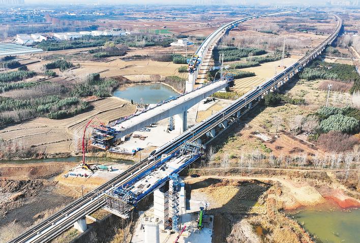 这是沪宁合高铁T型结构旋转梁和京沪高铁立交桥施工现场主体浇筑(12月27日摄,无人机拍摄)。 12月27日,由皖赣铁路安徽公司管理、中铁一局承建的沪宁合高铁跨越京沪高铁立交桥201.5米预应力混凝土T型结构转体梁主体浇筑完成,打下坚实基础,打下坚实基础。据悉,新建的沪宁合高铁是“八纵八横”国家中长期铁路网规划中沿江走廊的重要组成部分。是长江以北沿江城市与南京、上海都市圈便捷快捷的直达通道。新华网摄s社记者 杜宇